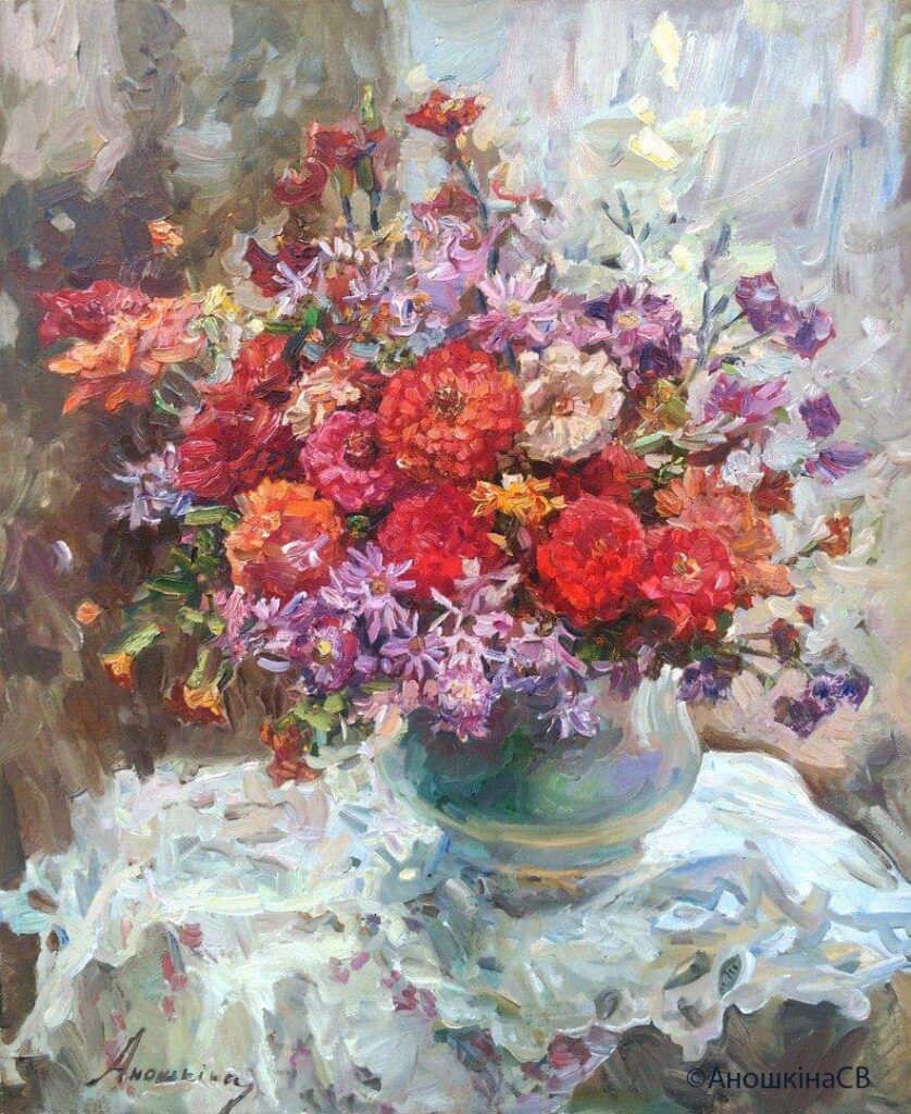 Flowers are the artist’s favourite theme, she adores their their colours. Svetlana often conveys her mood through flowers. One of the artist’s favourite flowers are roses, which she grows herself. You can order a painting with flowers or buy one displayed here.